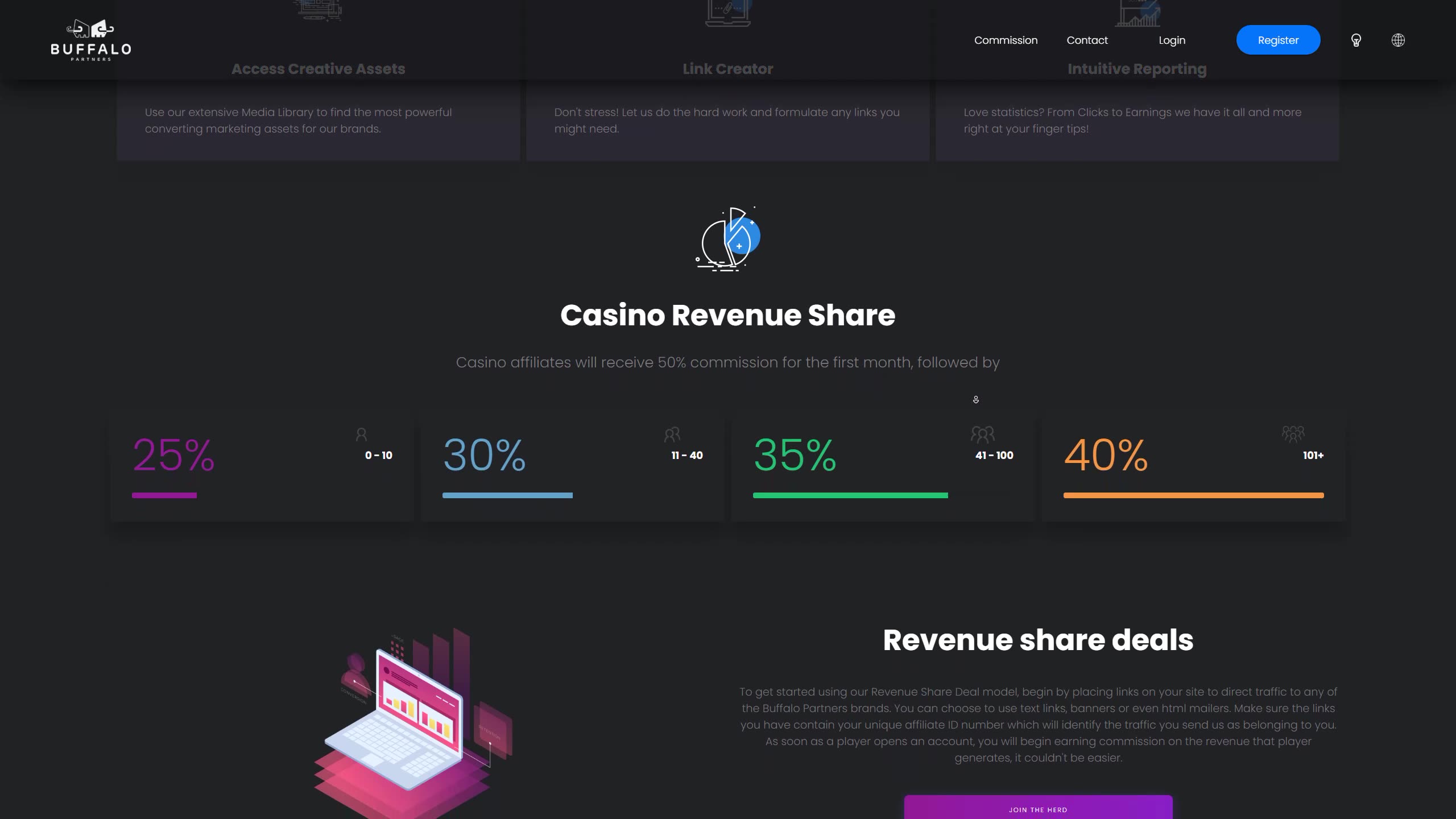 Buffalo Partners offers competitive commission rates that vary depending on the products you promote and the number of players you refer. The commission rates range from 25% to 50% of the net revenue generated by your referrals. You can also earn CPA (Cost Per Acquisition) and hybrid commissions, depending on the products you promote.